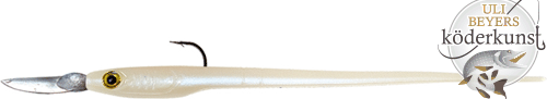 ACHTUNG! Bitte keine zusätzlichen Haken montieren. Diese behindern den tollen Köderlauf. Der schlanke Gummiaal wird von den meisten Räubern sehr aggressiv attackiert und die meisten Fische hängen auch so am Einzelhaken! Wir empfehlen außerdem einen Duolock der Größe 2 oder 3 – keine Wirbel. Auch hier wird die Beweglichkeit durch erhöhtes Gewicht am Kopf sonst eingeschränkt. Einige Barschangler bei uns haben an einer feinen Spinnrute wahre Orgien mit diesem Köder erlebt… Leichtere Bleiköpfe bewegen sich lebhafter, sind aber in Strömung und tieferem Wasser nicht geeignet. Schwere Köpfe lassen sich extrem weit werfen und sind auch in größeren Tiefen sehr gut einsetzbar. Uli Beyer hat beste Erfahrungen mit einer Kombination aus Zupfbewegungen, bis zu 1 Meter langen Zügen und dann Absinkphasen bis zum Bodengrund zurück gemacht. - Zusätzliche Information