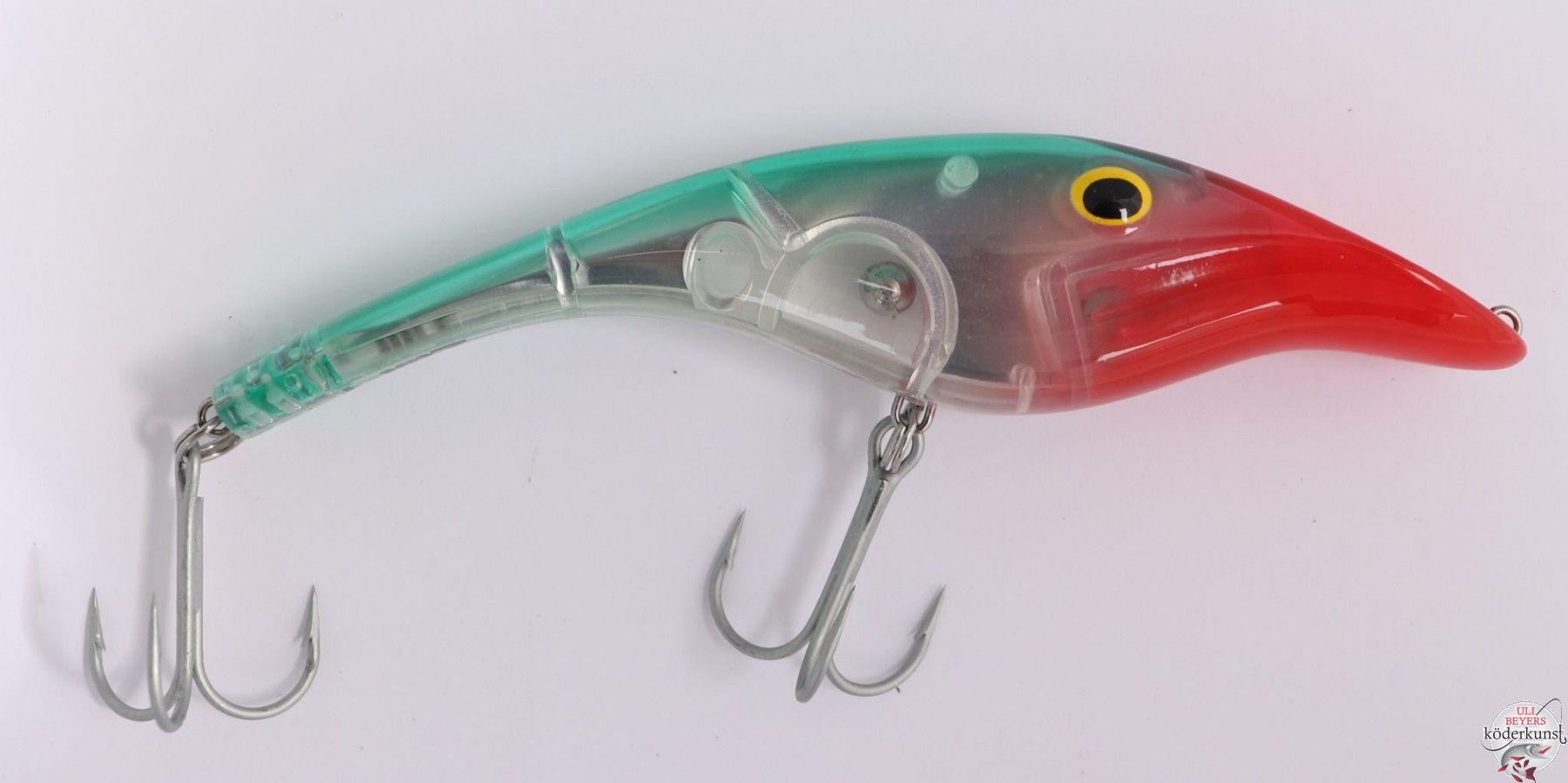 Durchsichtige Kunststoffe erlauben nämlich das Einlegen von besonderen Folien und damit tolle Effekte, die die Attraktivität der Zalt-Köder deutlich erhöhen können. Dieser Köder hat einen ganz besonderen "Metallic-Effekt", der aus dem Innern des Köders heraus glitzert! In Verbindung mit dem ins Wasser einfallenden Tageslichts ergeben sich Glanzeffekte wie bei einem echten Fischchen, was wohl auch das Urmonster, einen 21,2 Kilo schweren Hecht bei Uli Beyer im Boot verführen konnte. Das war Überzeugung genug, diesen Köder wieder bauen zu lassen. Ob auch Sie mit diesem tollen Köder einen Zalt-Riesenhecht verführen können? Wir drücken die Daumen!
