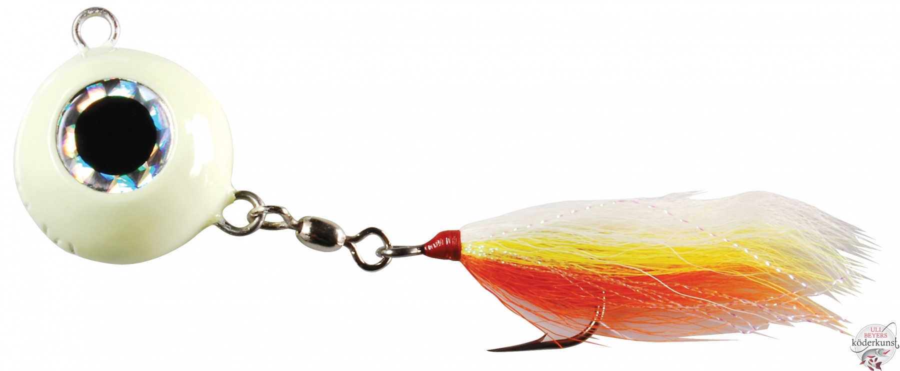 Dieser Köder aus Norwegen ist ein erstklassiger Köder als Alternative zu allem anderen wie Pilker, Shads oder Oktopusse. Der Köder hat ein besonderes Spiel: Die Kugel sinkt sehr schnell und der freie Einzelhaken bewegt sich mit dem Streamer in der Strömung. Der Einzelhaken vermeidet Fehlbisse und lockt den Fisch, wenn herkömmliche Methoden keinen Erfolg bringen. Die Kugel ist selbstleuchtend und das XXL-Auge entwickelt eine besondere Lockwirkung.