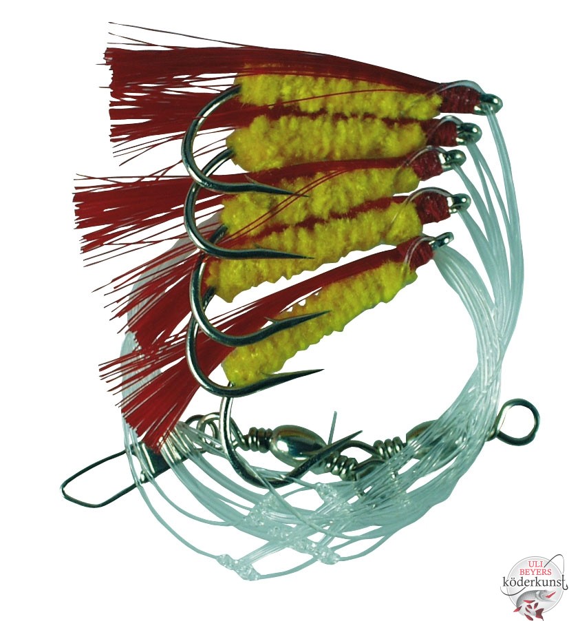 Makrelenvorfach mit roter Fliege und gelbem Schlauch: