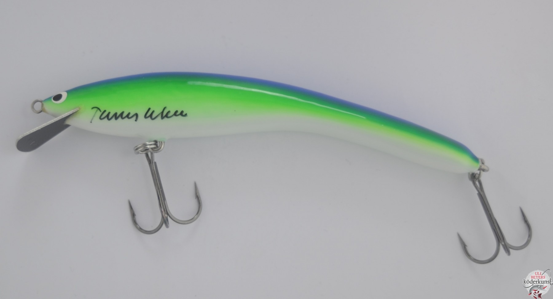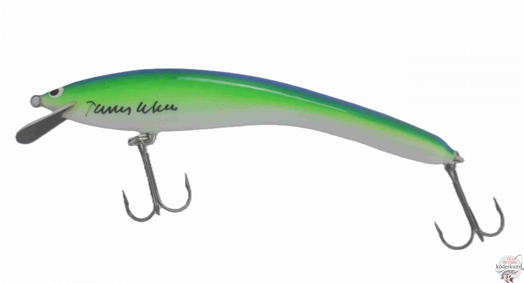 Es ist wohl ein Wink aus der Vergangenheit, dass der 16er Turus Ukko der erste neu-produzierte Köder ist, den wir jetzt in der UBS-Farbe anbieten. In den 90er Jahren war es Uli Beyer, der zwischen dem sehr lebhaften 12er und dem etwas ruhiger laufenden 20er Modell diese „Mittelgröße“ ausdrücklich gewünscht hatte. Die 16er Köder wurden damals speziell auf Ulis Wunsch hin entwickelt, denn schon damals war Uli Beyer als leidenschaftlicher Kunstköderexperte bekannt und anerkannt.