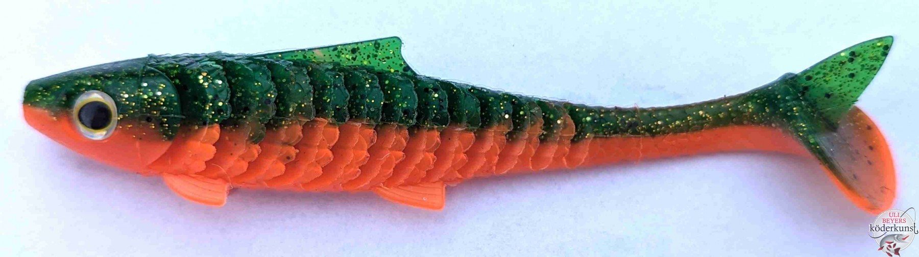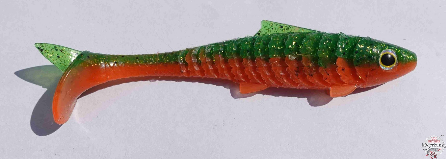 Der Rippler stammt aus Ulis Ideensammlung. Ziel war es, eine große Silhouette bei geringem Gewicht mit optimalen Laufeigenschaften zu kombinieren. Die aufwendig geformten Rippen haben eine echte Herausforderung im Formenbau dargestellt. Der Baby Rippler ist der kleinste Köder dieser Familie. Er stellt einen universellen Allesfänger dar, der schon in der Testphase aufhorchen ließ.
