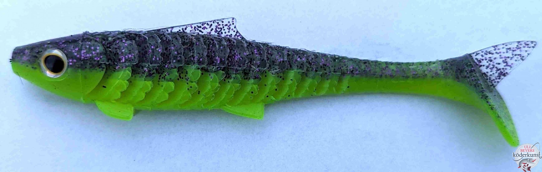 Der Rippler stammt aus Ulis Ideensammlung. Ziel war es, eine große Silhouette bei geringem Gewicht mit optimalen Laufeigenschaften zu kombinieren. Die aufwendig geformten Rippen haben eine echte Herausforderung im Formenbau dargestellt. Der Baby Rippler ist der kleinste Köder dieser Familie. Er stellt einen universellen Allesfänger dar, der schon in der Testphase aufhorchen ließ.