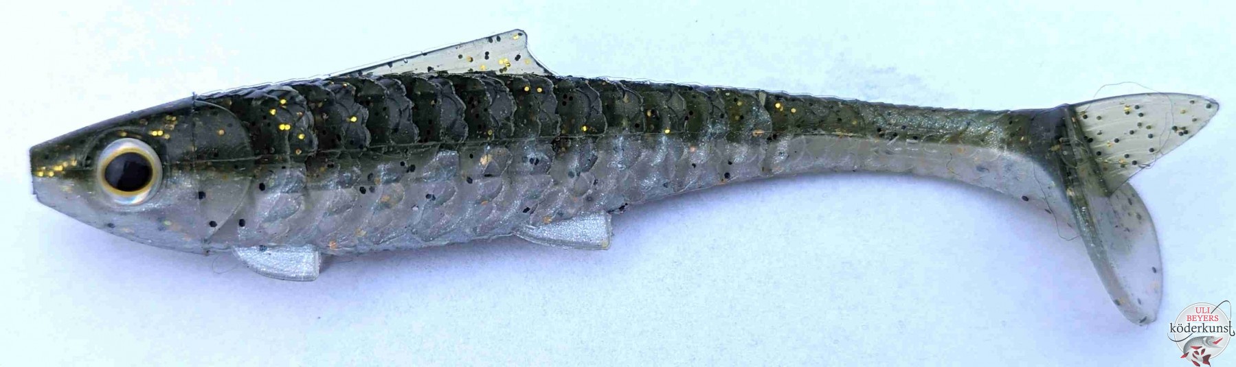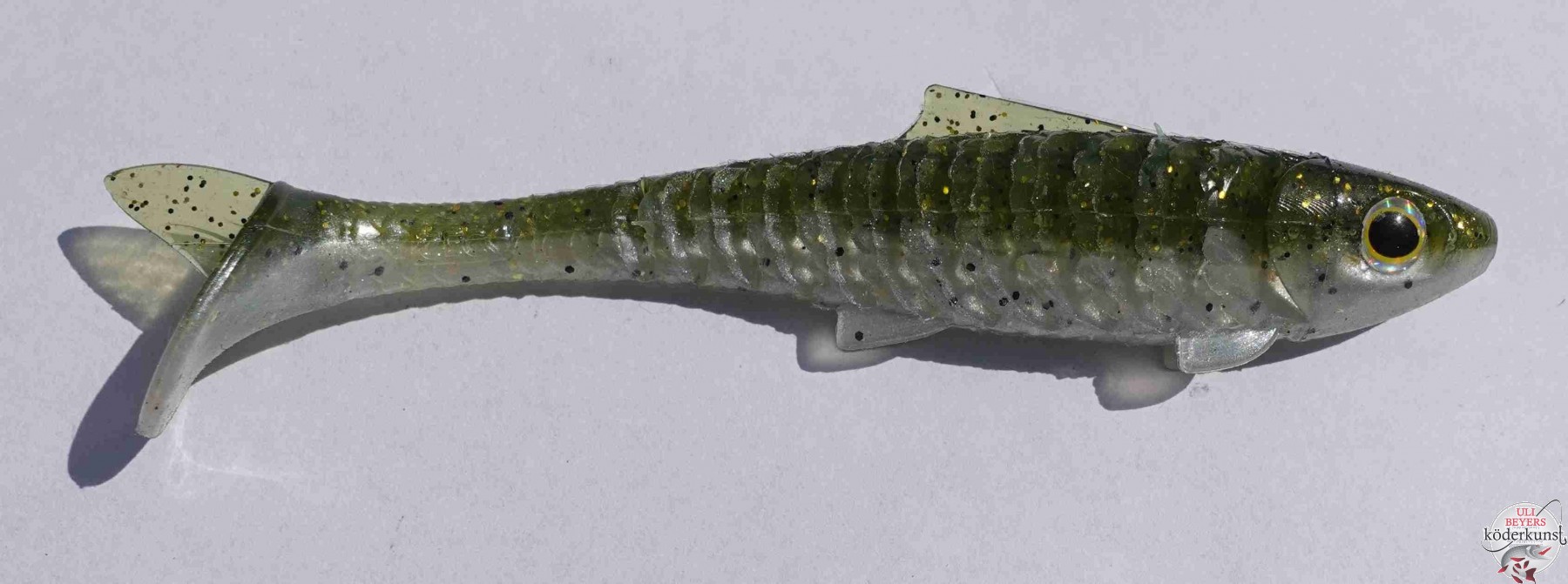 Der Rippler stammt aus Ulis Ideensammlung. Ziel war es, eine große Silhouette bei geringem Gewicht mit optimalen Laufeigenschaften zu kombinieren. Die aufwendig geformten Rippen haben eine echte Herausforderung im Formenbau dargestellt. Der Baby Rippler ist der kleinste Köder dieser Familie. Er stellt einen universellen Allesfänger dar, der schon in der Testphase aufhorchen ließ.